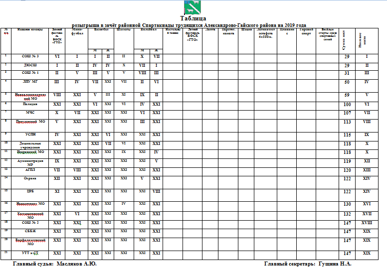 Таблица розыгрыша в зачёт районной Спартакиады трудящихся Александрово-Гайского района на 2019 года
