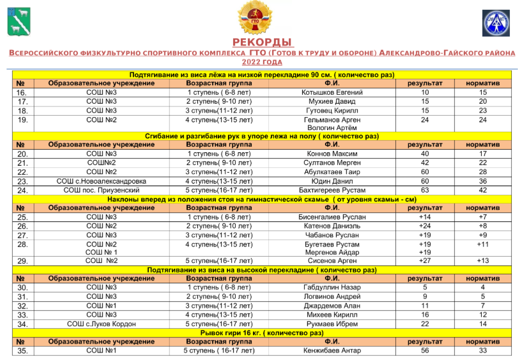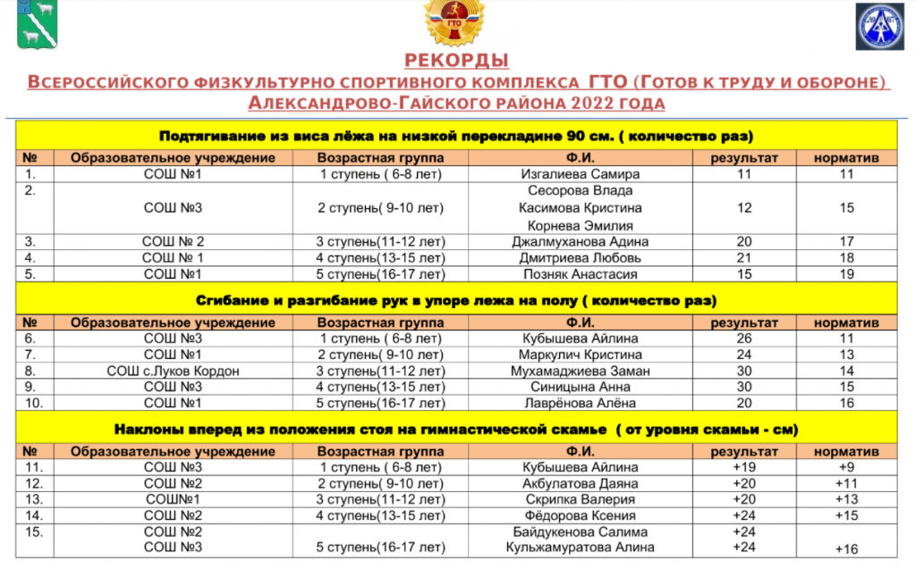 РЕКОРДЫ ВСЕРОССИЙСКОГО ФИЗКУЛЬТУРНО СПОРТИВНОГО КОМПЛЕКСА ГТО (ГОТОВ К ТРУДУ И ОБОРОНЕ) АЛЕКСАНДРОВО-ГАЙСКОГО РАЙОНА 2022 ГОДА