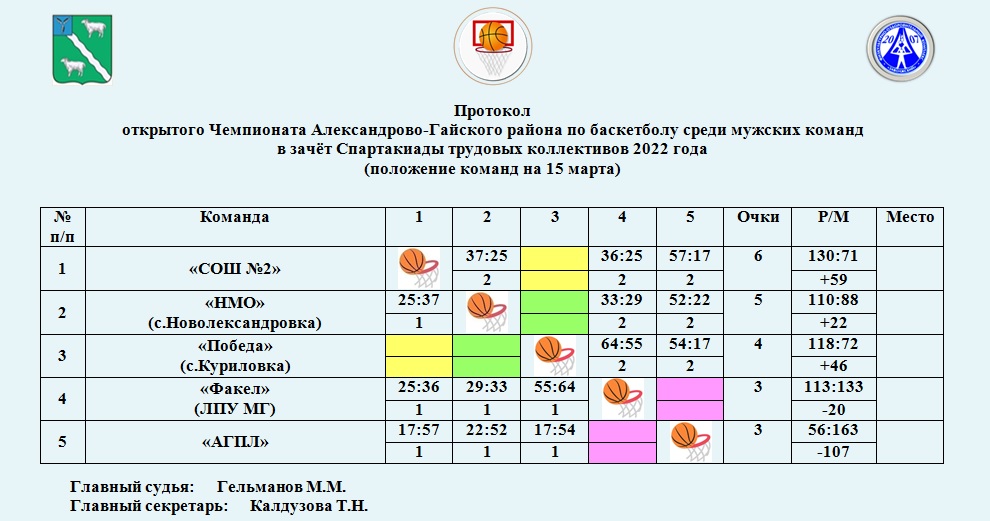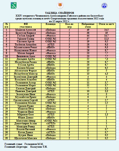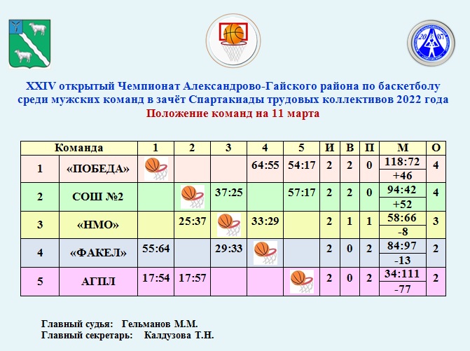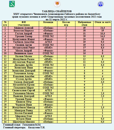 XXIV открытый Чемпионат Александрово-Гайского района по баскетболу среди мужских команд в зачёт Спартакиады трудовых коллективов 2022 года -Положение команд на 11 марта -Таблица снайперов
