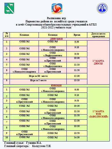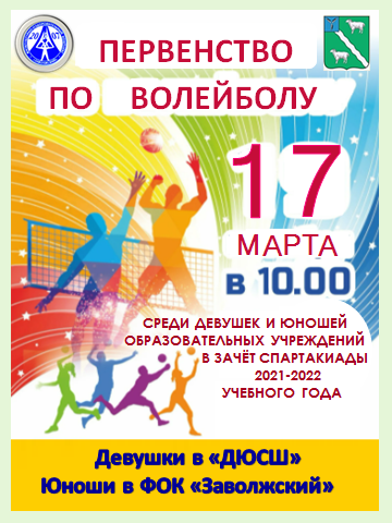 Первенство района по волейболу среди учащихся в зачёт Спартакиады общеобразовательных учреждений и АГПЛ 2021-2022 учебного года пройдёт 17 марта 2022 года - 10:00 ДЮСШ - девушки. 10:00 ФОК «Заволжский» - юноши.